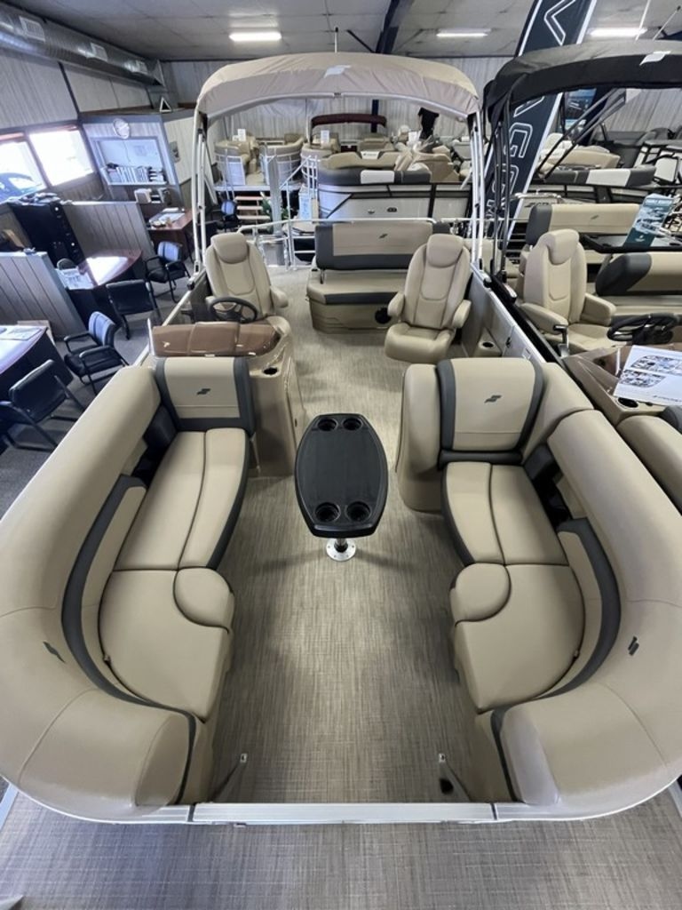 The Starcraft EX 22 Q DH pontoon boat features dual helm chairs for enhanced control and comfort, along with flip-back seating for versatile lounging. A stern couch seat adds to the relaxation, making it perfect for cruising and socializing on the water.