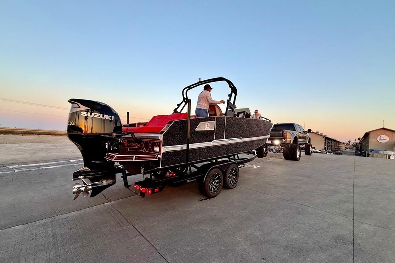 - Black tandem torsion axle trailer with premium features, including disc brakes, alloy wheels, swing tongue, ladder, transom steps, LED lighting, guide poles, and more—fully equipped for easy hauling and launching.