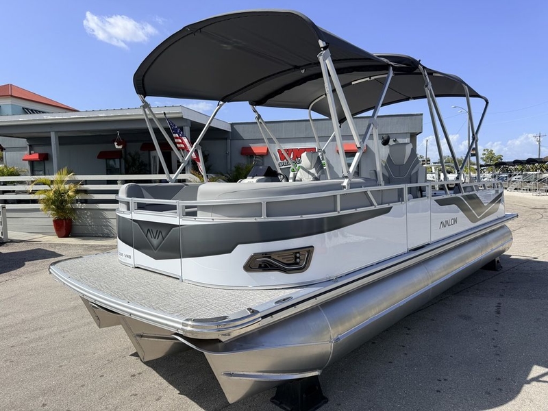 A luxury compact pontoon boat model, the Avalon 2585 Venture 85 VRB has two front and two rear-facing full-length lounge benches in the bow and aft portions of the boat and large rear bed with flip back bench. This allows for a large, open floorplan throughout the boat. As with all our models, all furnishings in the LS are mounted on the world's only aluminum lifetime seat frames with no wood or plastic components. These seat frames feature the industry's only flow through dry ventilation and seat base cladding. Options include, Graphite Vinyl 1 Silver Vinyl 2, and bright white accent, Riptide Shadow flooring, seat cover's, 2 High Back admirals chairs with bolsters, USB w / AUX, Black soft grip steering whee, Lights under the rub rail, 1 Lilly pad ladder rear entry, Rectangle table, Tri Toon with wave glider package, Privacy station, Fully welded cap fins, solid bottom keels, Chrome Dock lights, Outboard ski tow bar, Salt water package, SS Gated aft rail, side keels, Electric power assist steering, 4 body holders, side keels, 2 portable cup holders, 4 pull up cleats, High performance sound system, Chrome package. Powered by a 200hp Mercury V-6 4 stoke motor . Price includes Boat, Motor, Stainless pro, Coast Guard Package, Rope and anchor, and full demo. Sales tax, bottom paint and trailer are extra.