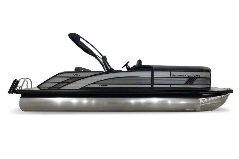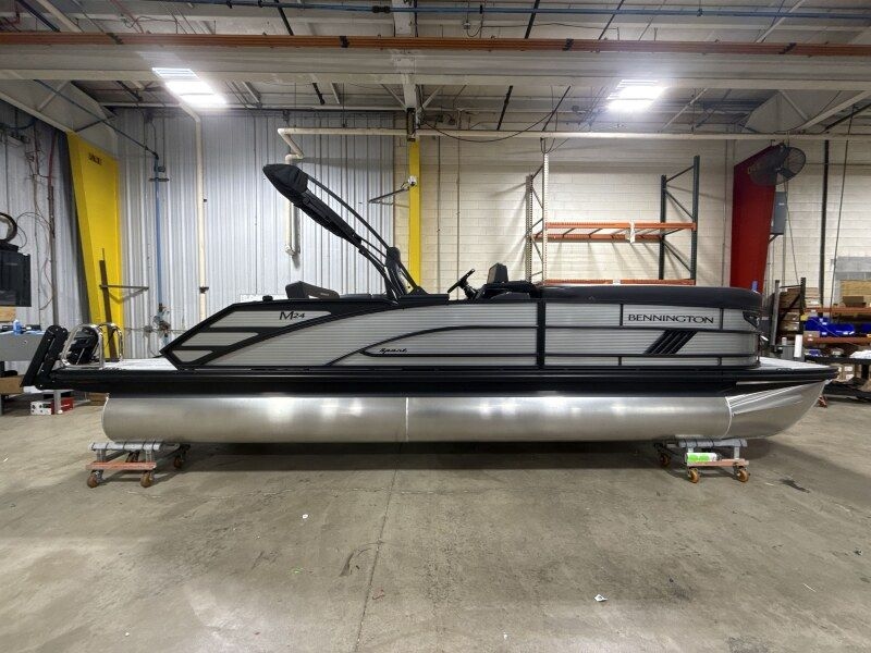 Introducing the 2026 Bennington 24MSB-SPS (PB), a luxurious and powerful pontoon boat equipped with a 150 HP 4-Stroke Mechanical Yamaha engine. This model features a sleek electric power bimini top with a stylish curved design and a dual switch battery system for enhanced convenience. Enjoy vibrant LED toekick lights, lumbar lighting, and illuminated black cup holders that add a modern touch to the Arctic Ice White Simtex interior. The sport furniture arrangement in the M Series and the metallic silver paneling, alongside the elegant zebrawood matte slate accents, create a sophisticated ambiance. The canvas is finished in a striking midnight black, complemented by a textured black rub rail insert and a ski tow bar for exciting water sports. Additional features include bow and aft pop-up cleats, the Rockford Fosgate M1 lighted speakers, and a robust SPS Performance Package with a 33-gallon transom direct fill tank. The blackout luxe package enhances the aesthetic appeal, while in-floor storage keeps your space organized. Stay in control with the LaColla black steering wheel, integrated headlights, and a state-of-the-art 12" Vivid UX touchscreen display for digital switching. The elevated console with pocket black styling and a captain's recliner ensure comfort and convenience on your adventures.