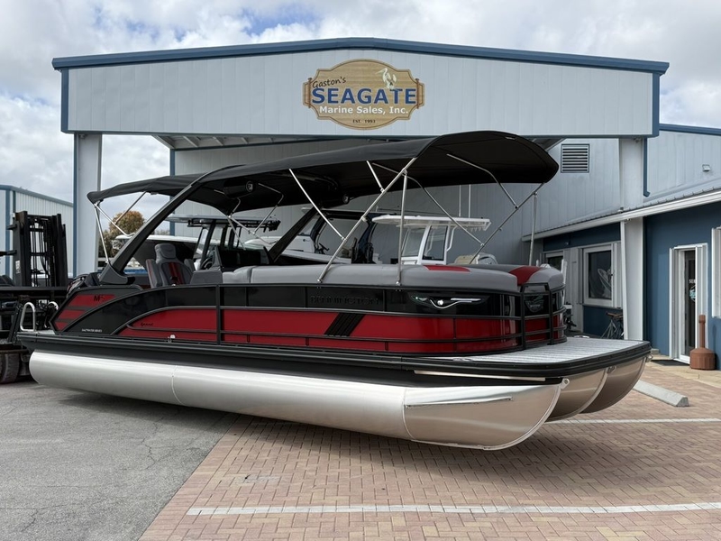 A 2026 26MCSB equipped Bennington's Sport Package and Carbon Fiber Arch. Powered by a color-matched, Mercury 300 ProXS with Race Red and Carbon Fiber Decals.