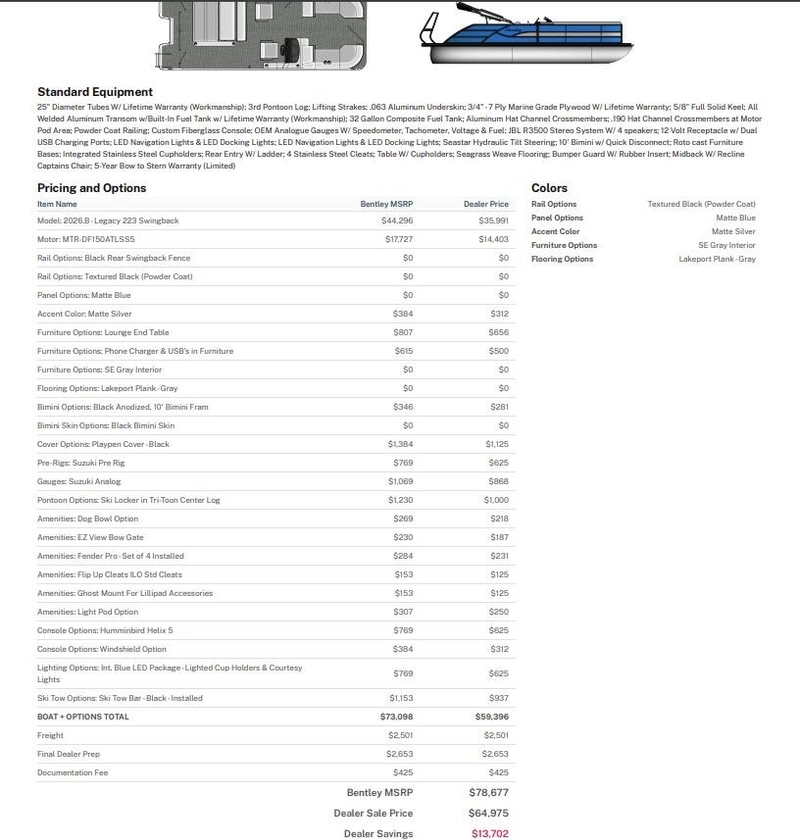 2026 Bentley Pontoons Legacy 223 Swingback DF150ATXSS5