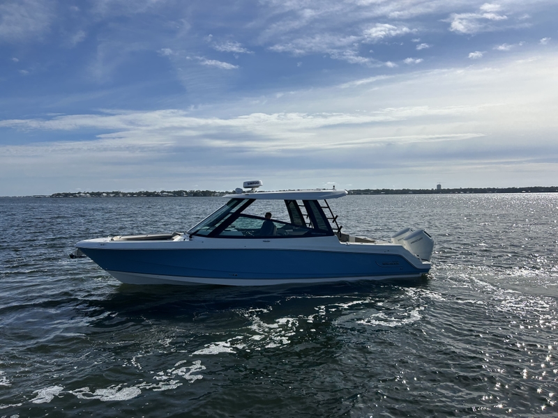 Built on Whaler’s legendary Unsinkable Unibond™ hull, the 330 Vantage is powered by high-performance Dual Mercury Verado Outboards with available Joystick Piloting, ensuring effortless docking and superior handling even in challenging conditions. The expansive deck layout features an award-winning convertible port lounge that adjusts to multiple positions, a spacious bow with plush loungers, and a well-appointed helm with integrated Simrad electronics. Below deck, you’ll find a generous head compartment in the port console and a cozy cabin/settee in the starboard console, making this the perfect 'all-day' boat for the Gulf Coast.