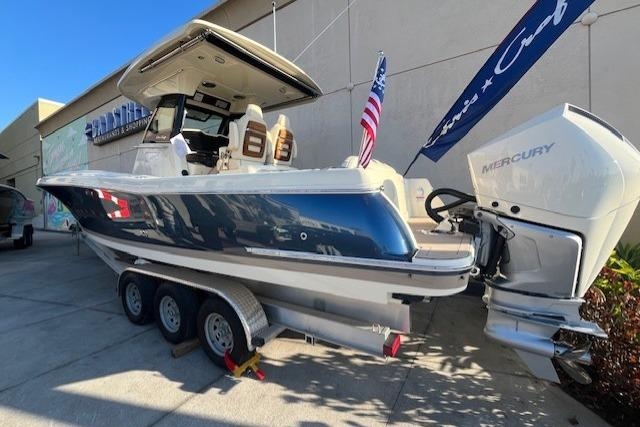 Introducing the 2026 Chris-Craft 31 Catalina, a stunning vessel powered by twin Mercury Verado 300 engines featuring DTS and Joystick Piloting for effortless maneuverability. With its eye-catching Blue Crystal Metallic painted hull complemented by a Macadamia gelcoat stripe, this boat exudes elegance. Step inside to discover an Almond vinyl base and insert in the cockpit, a helm seat equipped with a livewell, and a beautifully woven Seagrass flooring. Enjoy the comfort of a forward bow filler cushion and stay connected with dual 16-inch Garmin multifunction displays. Experience superior sound quality with an upgraded premium audio system featuring stainless steel grills. The Seakeeper Ride System ensures a smooth journey, while a stylish teak table and underwater lights add to the allure. Additionally, a convenient windlass makes anchoring a breeze.