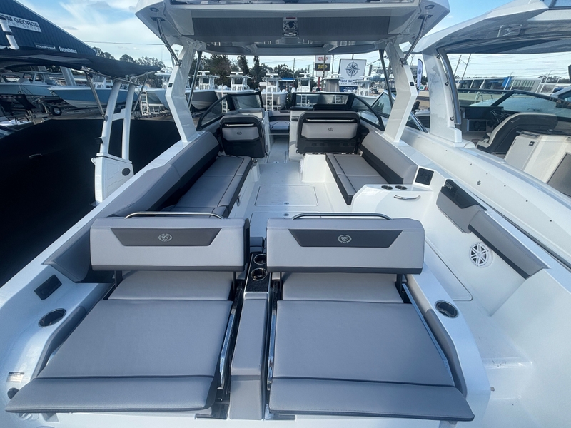 Owning the Cobalt R31 OB means embracing a lifestyle filled with fun, relaxation, and unforgettable memories. This cruiser is crafted for those who cherish the finer things and wish to share them with loved ones. The expansive seating and social areas are ideal for entertaining, enjoying meals outdoors, or lounging comfortably while taking in the sights. The air-conditioned cabin offers a cool escape from the sun, while the electric awning delivers instant shade at the push of a button. The adaptable dinette table and bow center cushion insert let you customize your seating for dining, sunbathing, or conversation. With its elegant Frost/Slate interior and navy accent stripe, the R31 OB radiates sophistication, making every outing a special occasion.