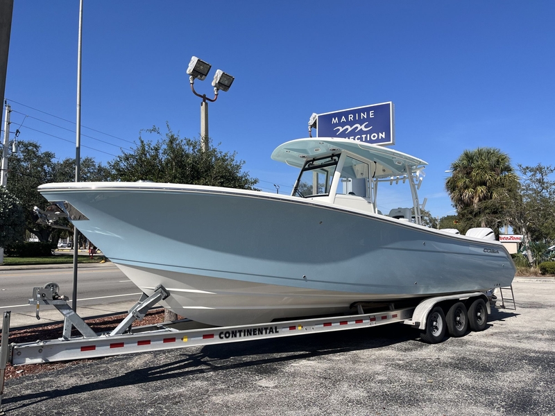 Introducing the all-new 2026 Cobia 320 CC! This spacious center console boat is designed for serious fishing enthusiasts and families alike. With its robust hull, the 320 CC is perfect for long-range adventures while still being easy to trailer. It features a tournament-ready layout that doesn’t compromise on comfort and style. Anglers will love the expansive, unobstructed cockpit, complete with a tackle center that includes a sink and a generous bait prep area, ample under-gunnel rod storage, macerated in-deck fishboxes, and dual pressurized livewells boasting a total capacity of 70 gallons. Powering this vessel are twin white Yamaha F350XSA2 engines with digital electric steering and stainless steel props.