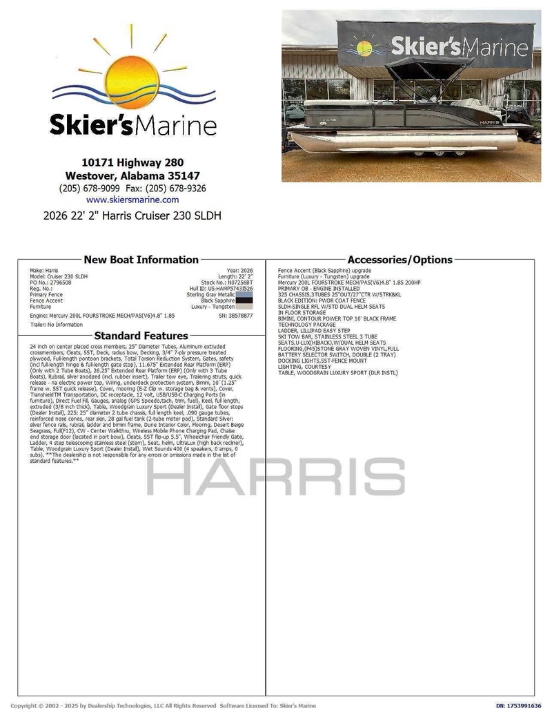 Introducing the 2026 Harris Cruiser 230 SLDH, the perfect pontoon for families and adventurers who crave a harmonious mix of performance, comfort, and durability. This model features the innovative RPM Technology chassis, ensuring a smooth and stable ride while enhancing fuel efficiency. Enjoy luxurious soft-touch seating and adaptable layouts, including a single rear-facing lounger (SL) and dual helm (DH) configurations. The experience is further enhanced with amenities like a power Bimini top, an integrated swim ladder, and optional entertainment upgrades such as Wetsounds audio and RGB lighting. With its stylish design and robust features, the 2026 Harris Cruiser is ready for endless adventures.