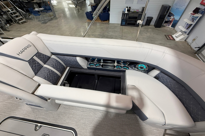 2026 Harris Grand Mariner 250 (Stock #217130) blends refined luxury, powerful performance, and thoughtful entertaining features into a premium 25-foot pontoon designed for unforgettable days on the water. Finished in Ceramic White with a White Diamond accent and Black powder-coated fence, this Grand Mariner delivers a striking, modern look paired with Harris’ signature craftsmanship. Powered by a White Mercury 425L V10 with joystick control, it’s built for confident handling, smooth cruising, and effortless docking at Lake Norman.