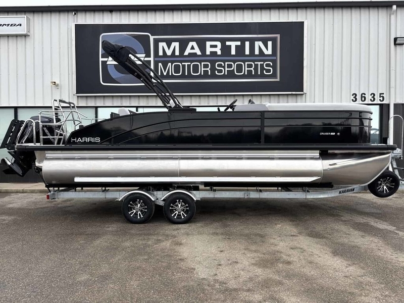 The Heritage Cruiser 230 is a premium, blackout-styled version of Harris’s popular Cruiser series. It’s designed as a versatile, luxury-leaning pontoon/tritoon that balances comfort, performance, and style. The Heritage Edition features premium upgrades like Heritage badging, contour electric bimini, and Lillipad Marine® ladder.