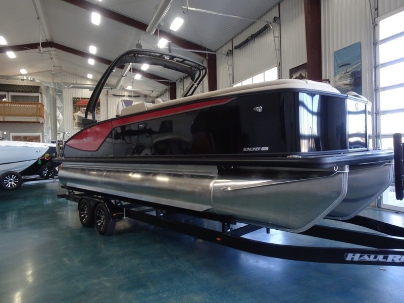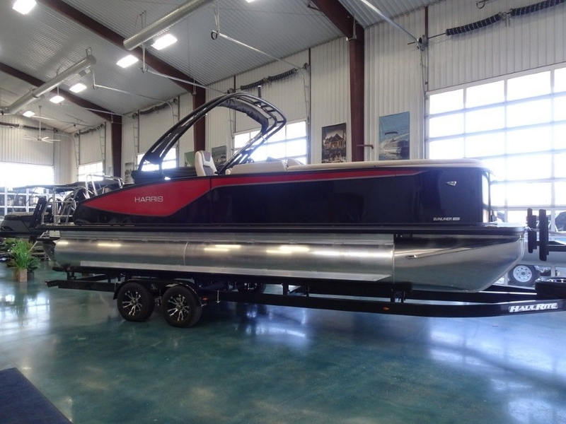 This is a new 2026 Harris Sunliner 250 Sport Tri-toon in Black Sapphire w/Blush Red Accent and Lux Dune Interior. It is powered by a Mercury 300hp Verado 4-Stroke DTS/PAS and has the following options: