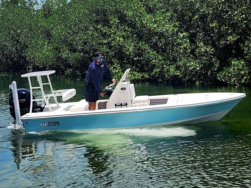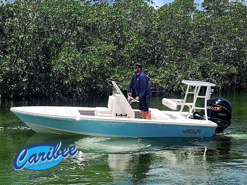 This Hewes boat is packed with features that enhance your boating experience. The two-tone Atlantic Blue hull not only adds elegance but also ensures durability against the elements. The white cushions offer a clean, modern aesthetic while providing comfort for long days on the water. The poling platform and tower are ideal for sight fishing, granting you an elevated view of your surroundings. A 34-inch platform with backrest provides added convenience and support. For anglers seeking precision, the white 6-foot Power Pole on the starboard side allows for quick, silent anchoring in shallow waters for perfect casting. The mechanical engine controls with CL5 gauge ensure smooth operation, while the Sea Star tilt helm and GEM stainless steel trim tabs further enhance your ability to tailor your ride to any water condition.