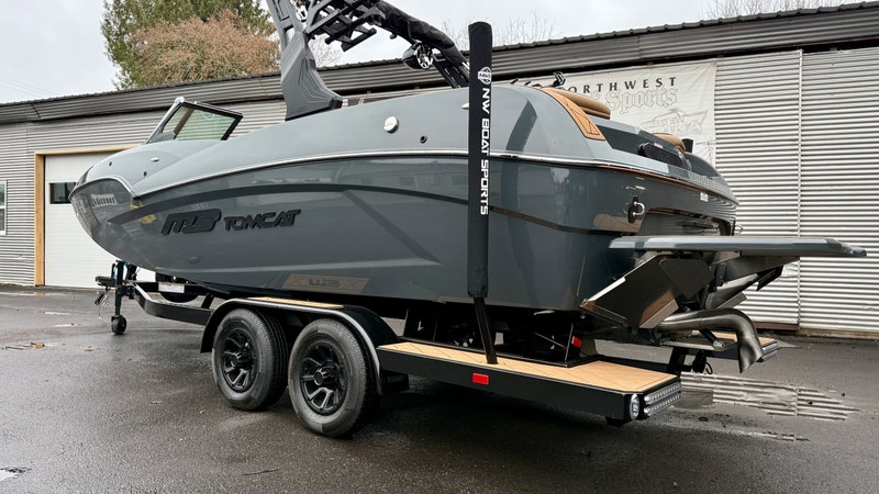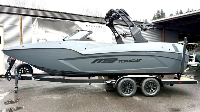 The 2025 MB Sports F22 Tomcat Alpha is a versatile 22-foot picklefork bow wake/surf boat known for its performance, large lounge area, and customizable features, offering standard MB Surf System, surf pipes, and powerful engine options (Indmar/PCM) for creating great wakes and waves, alongside deep storage and premium interior options like GatorStep flooring for all watersports. It seats up to 14 people and combines MB's quality construction with aggressive styling, making it a popular choice for serious riders.