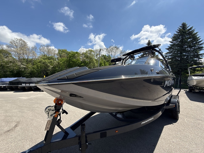 Introducing the 2025 Moomba Mojo, a high-performance boat powered by an Indmar 6.2L Raptor engine delivering 400hp with a 1.7 transmission. This model features an upgraded Surf Pipe Exhaust and a Nibral propeller, 15.5x16.5 with 4 blades for optimal performance. Enjoy comfort with an electric adjustable driver's seat, a removable seat back kit, and sundeck flip-up backs. The boat is equipped with Gator Step flooring in a sleek graywood finish and a black stainless steel rubrail for added durability. The PRO Tower in black comes with a black LZ shield, swivel board racks, and a tower bimini for shade on sunny days. Sound quality is enhanced with a pair of 10" tower speakers and upgraded cockpit speakers with an amp and subwoofer. Navigate with ease using the dual-screen dash upgrade featuring GPS maps, and illuminate your path with docking lights and RGB lights. Additional features include a Roswell mirror, the Flow 3 Surf System with G6 ballast, Zero Off GPS cruise control, a cockpit heater, side storage bags, and a swim platform drop step. This package also includes a Boatmate tandem axle trailer with transom steps and a swing tongue for easy transport. The boat's striking design showcases a 'Classic' spray pattern in dark graphite as the main color, light graphite accents, and the Moomba Premium Biggie logo in white. Interior features include white Thermoskinz on the internal rail, khaki Thermoskinz insert panels, dark graphite welt color, and black thread color for a cohesive look.