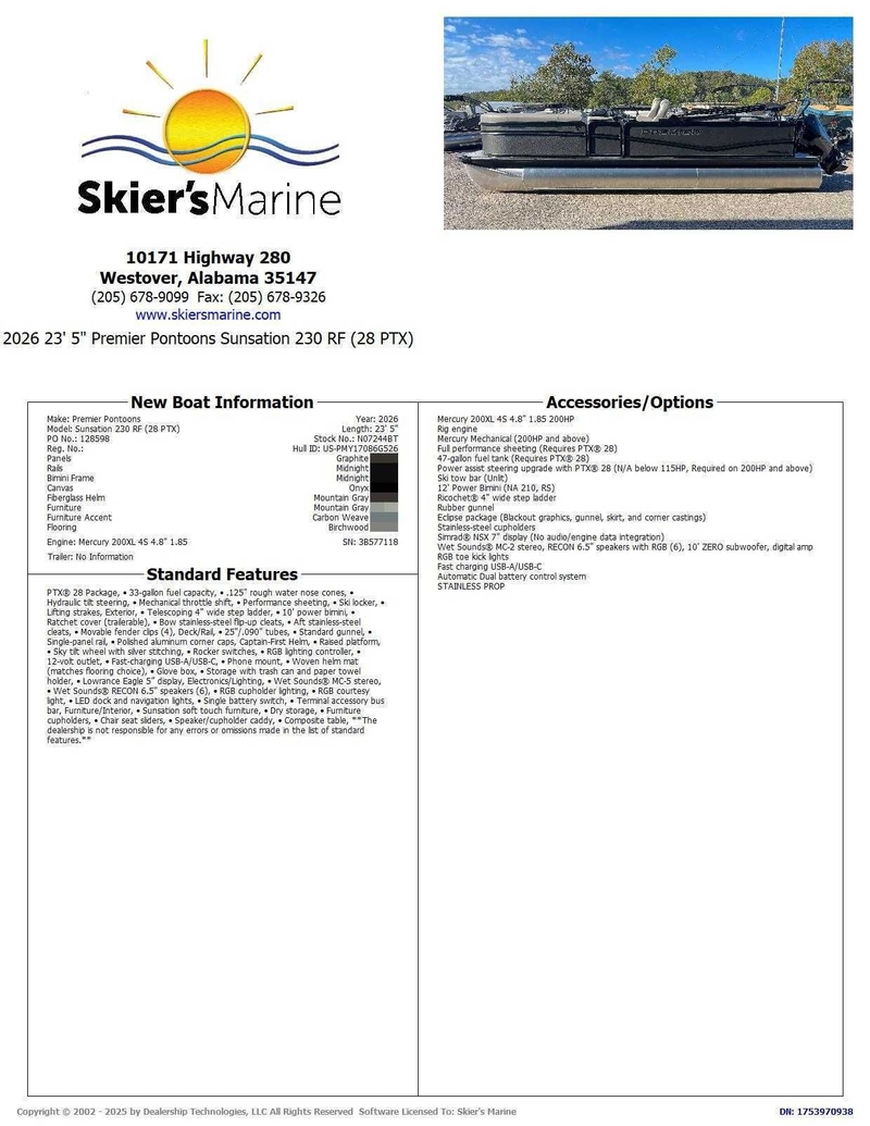 Introducing the 2026 Premier Sunsation 230 RF (28 PTX), a remarkable 23-foot pontoon boat that masterfully combines luxury and high performance. Featuring Premier's cutting-edge PTX tritoon chassis, this boat delivers a smooth and nimble ride, reminiscent of a runabout while ensuring enhanced stability and handling even in choppy waters.