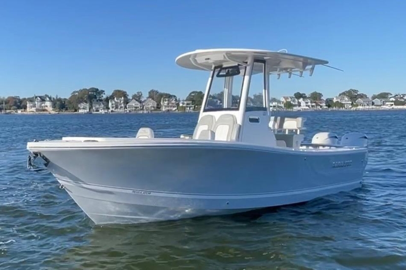 POWERED BY TWIN WHITE YAMAHA F150 W/DIGITAL ELECTRONICS CONTROLS, INTEGRATED ELECTRO HYDRAULIC STEERING