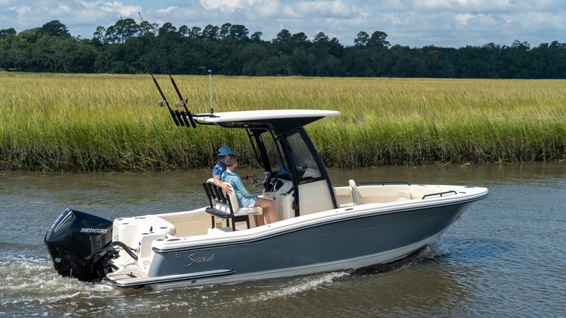 Introducing the 2026 Scout 220 XSF, an absolute fish-finder, with creature comforts and incredible styling. The 220 XSF is built on Scout's revolutionary fuel saving NuV3 hull design, with no sacrifice on performance. While the deck offers ample standard amenities for everything from serious fishing to comfort cruising. Built with 100% hand-laid fiberglassm the boat boasts a wide comfortable beam of 8'6' with an overall length of 21'6'. A notable standard feature onboard the 220 XSF includes note only the forward seating in the bow, but also a forward sun lounge/coffin box complete with a cushion.