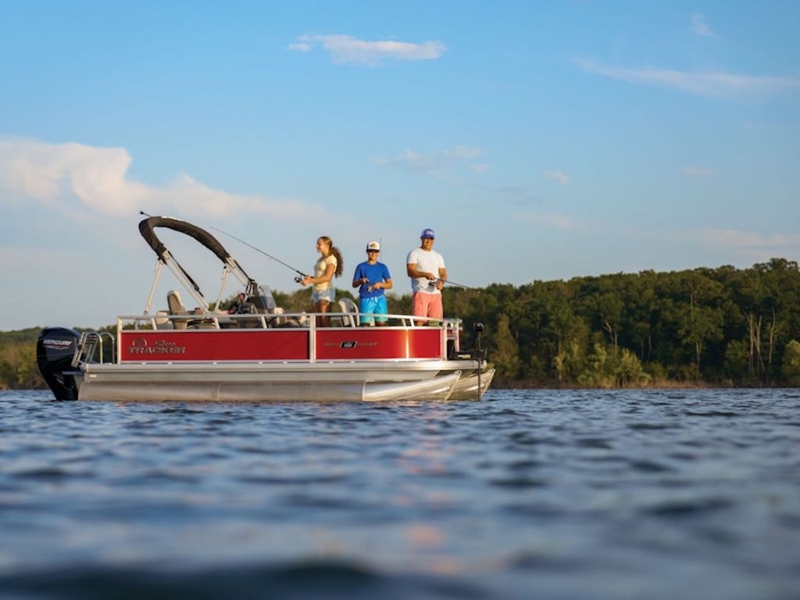 This seven-passenger fishing pontoon hits the water with new console and lounge designs. Get three extra cubic feet of storage thanks to clever backrest cut-outs. The redesign also adds a seat in front of the driver console, phone compartments, and four more cupholders. Cast from the shade of a standard 7' bimini top in one of the two folding fishing seats. Find your spot on the lake from the decked-out driver console, which comes with its own rod holder.