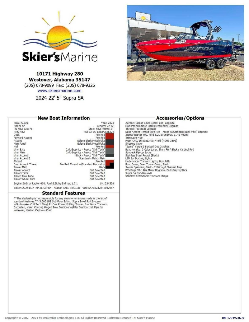 Introducing the 2024 Supra SA, a boat celebrated for its exceptional craftsmanship, designed to provide an unparalleled wake and surf experience. Featuring advanced hull technology and the innovative Swell Surf System, it generates impressive, customizable waves suitable for riders of all abilities. Inside, you'll find luxurious comforts and state-of-the-art features, including Chill Tech Vinyl and the Supra Command Center. With a strong warranty and excellent resale value, owning a Supra is a wise investment for endless summertime adventures and a superior ownership experience.