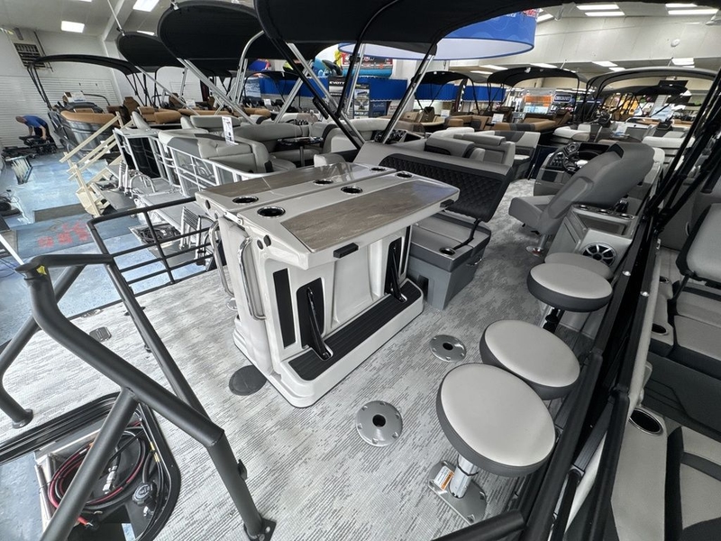 The Sylvan L3 DLZ Bar presents a one-of-a-kind experience with its innovative design, featuring a rear lounge that seamlessly converts into a four-person bar. This unique layout sets it apart, leaving everyone envious of its versatility and style. Whether you're looking to relax in the spacious lounge or entertain friends at the bar, this pontoon offers the ultimate in luxury and functionality. Equipped with the standard SPX third tube performance package, the Sylvan L3 DLZ Bar ensures smooth cruising and stability, guaranteeing a safe and enjoyable journey for all. Its sleek exterior design and modern amenities make it a standout on any body of water. Plus, with the added convenience of a power canopy, passengers can stay shaded and comfortable during extended outings. From leisurely days on the water to lively gatherings with friends, the Sylvan L3 DLZ Bar delivers an unmatched experience that will leave everyone wanting more.