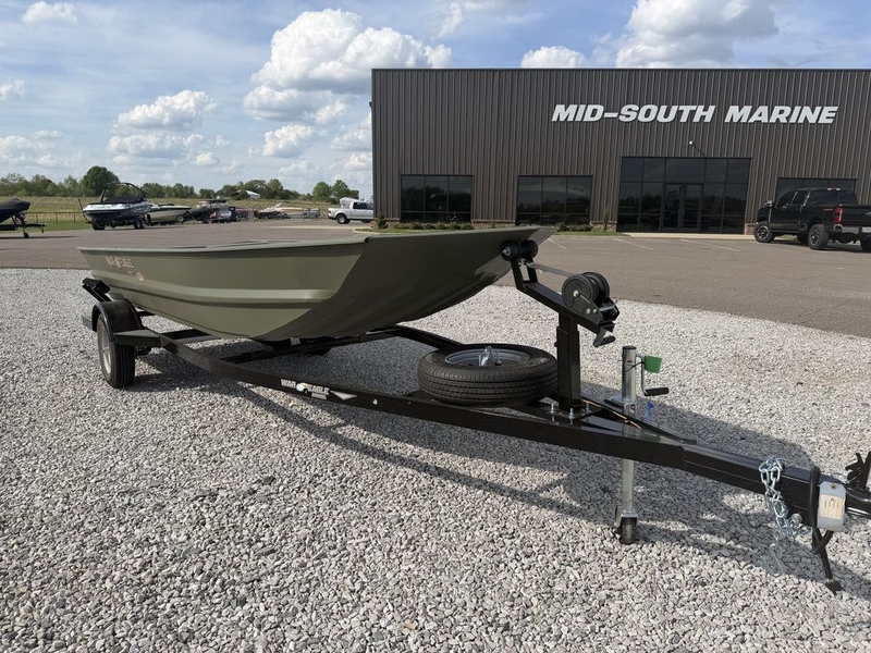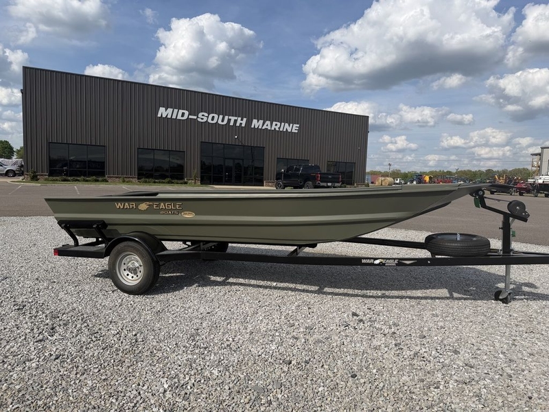 War Eagle 648 mod-v tiller steer boat, rear deck lid/fuel tank cover, trolling motor bracket, tread plate floor, OD green. Hull only price, trailer available, engines available from Tohatsu, Yamaha, Mercury