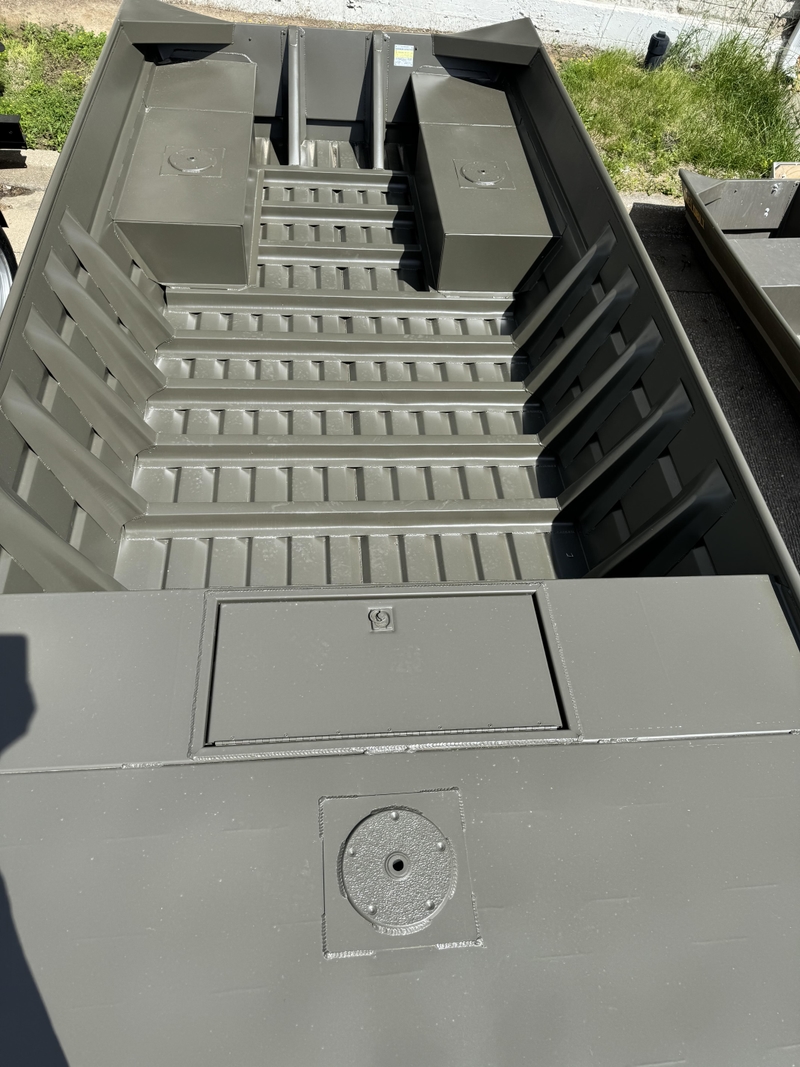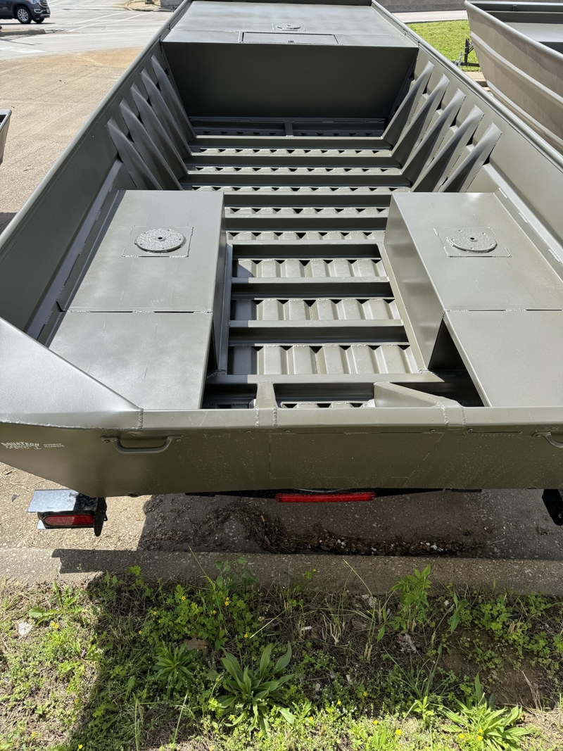 2024 Weldbilt 1860MF has a 60' bottom with a 89' beam, 28' sides and .100 gauge aluminum. Standard 20' transom, extra knee brace, split seats at stern with seat bases, open through the middle no seats, 48' front deck with 16', seat base, and lockable storage,