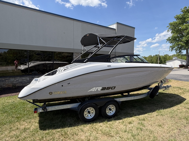 The 2026 Yamaha AR250 is a 25-foot jet boat designed for families and watersports enthusiasts, offering strong twin-engine performance, advanced helm technology, generous seating and storage, and enhanced safety from jet propulsion. Engine Type: In-Line