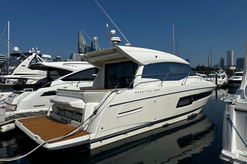 Now available in Chicago, this 2018 Prestige 460 Coupé is a rare opportunity to own a lightly used, impeccably maintained yacht with just 250 hours on her twin Volvo D6 IPS 600s (435hp each).
