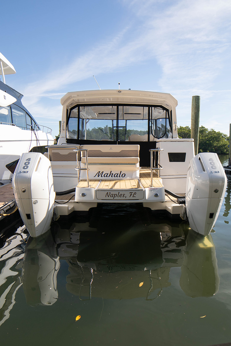 Powered by twin Mercury 400 V10 outboards, this Aquila36 provides impressive speed, smooth operation, and easy maintenance.