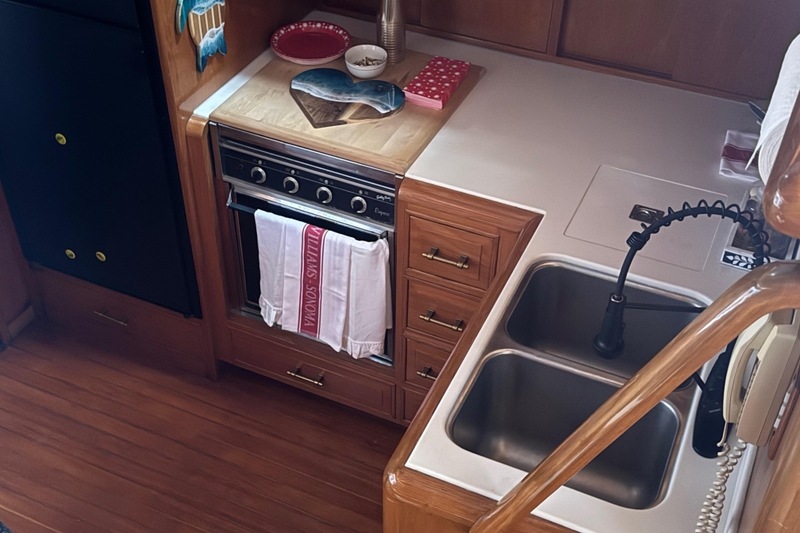 The galley is designed for efficiency with counter space and sinks running along the starboard side, a stand-up refrigerator, a three-burner electric stove with an oven, and plenty of storage.