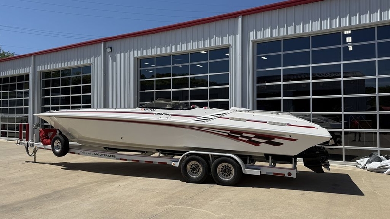 2000 Fountain 35 Lighting powered by Twin Mercury 502 mag mpi with only 163 hours, Bravo 1 drives, trim tabs, mechanical indicators, halon fire suppression system, gaffrig gauges, electric bolsters, cabin sink, cabin cooler, forward v berth, cabin lounge, porta potty, stereo, myco tandem axle trailer included