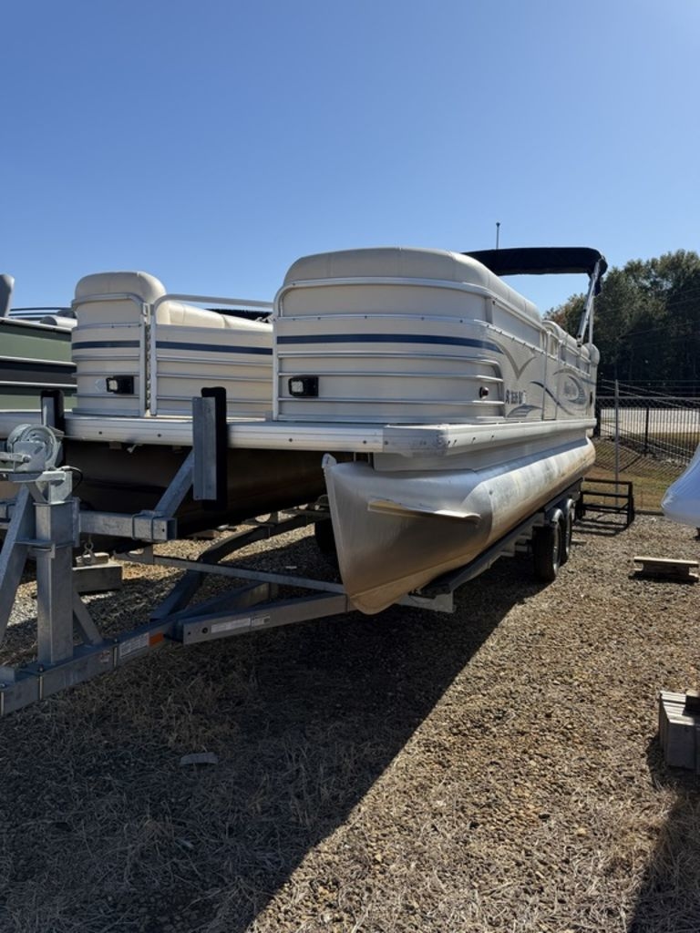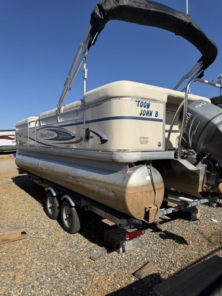 The 2007 Aqua Patio 220 BC is a family cruiser pontoon boat featuring a 'BC' (Bimini/Changing room) layout, capable of seating up to 11 people, with a length of approximately 23 feet. It includes a bimini top, a rear sundeck with a changing room, plush L-shaped seating, a rear-facing chaise lounge, and an elevated ski tow bar. Key features of the helm include an automotive-style console with easy-to-see gauges, a standard compass, and a sound system, while the exterior has stainless steel cleats, docking lights, and a rear swim ladder.