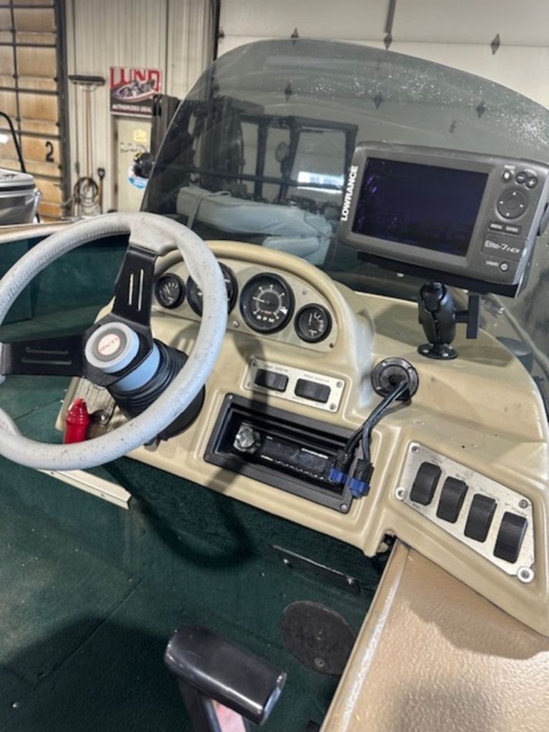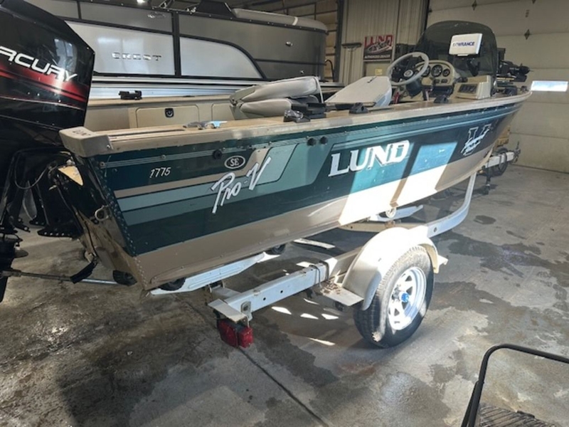 1997 Lund 1775 Pro-V with a Mercury 115HP s troke motor. Boat sits on a 1997 Easy Loader trailer and comes equipped with a Minnkota 24V Power Drive trolling motor, three seats, and a nice boat cover. Transom was replaced in 2025 by Shamrock Boat Sales.