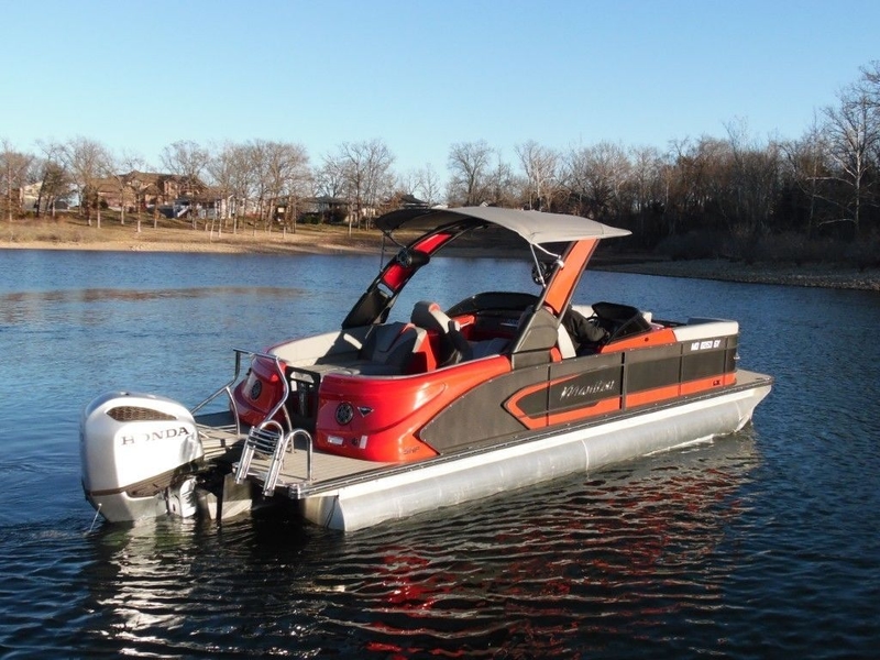 This is a very clean 2023 Manitou 25 XT RFX Tri-toon powered by a Honda 250hp 4-Stroke with only 15 hours. It has a matching tandem axle trailer and is loaded with options that include: