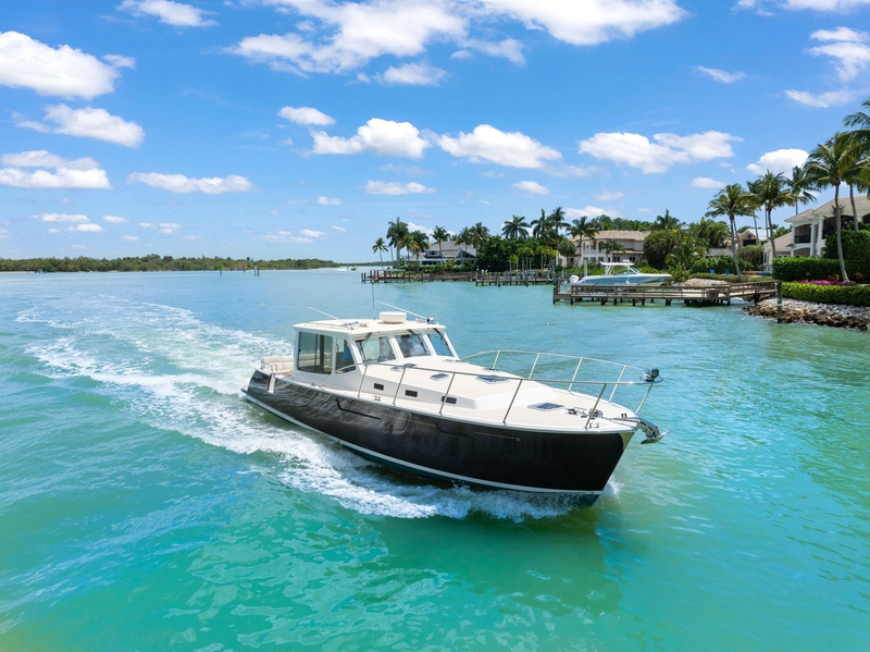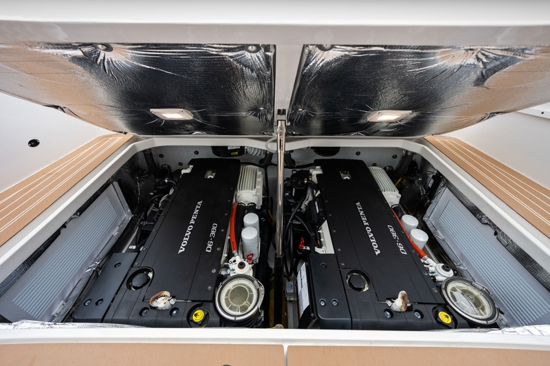 - Twin Volvo Penta D6 380 HP with DPI (Duoprop Inboard) drives — crisp throttle response, stronger acceleration and shorter takeoff, improved fuel efficiency at cruise, reduced vibration and noise, and exceptional low‑speed handling and precise maneuverability in tight quarters.