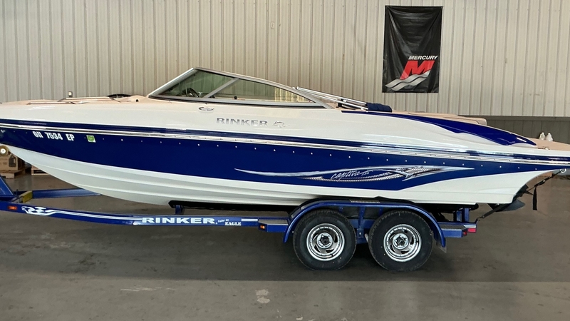 This Rinker is great condition and looking for a new owner. The spacious and comfortable bow and cockpit area offers plenty room for all family and friends. The cockpit area also has plenty of seating and cockpit table with an on-board cooler, under seat storage and in-floor storage. The large layout area at the stern of the boat offer opportunity for sun bathing or just relaxing. This Rinker also features a walk-thru transom with filler cushion. The Bimini top provides all the shade you will need on those extra sunny days. You can utilize the bow and stern ladders to enter/exit the boat. You can also utilize the Clarion AM/FM/CD stereo with JL Audio speaker for all your favorite music. This Rinker is equipped with a MerCruiser 5.0 ; engine with only 344 hours. It also includes a full mooring cover with poles. This package sits on a tandem axle Eagle Trailer. The tires on the trailer are approximately one month in age.