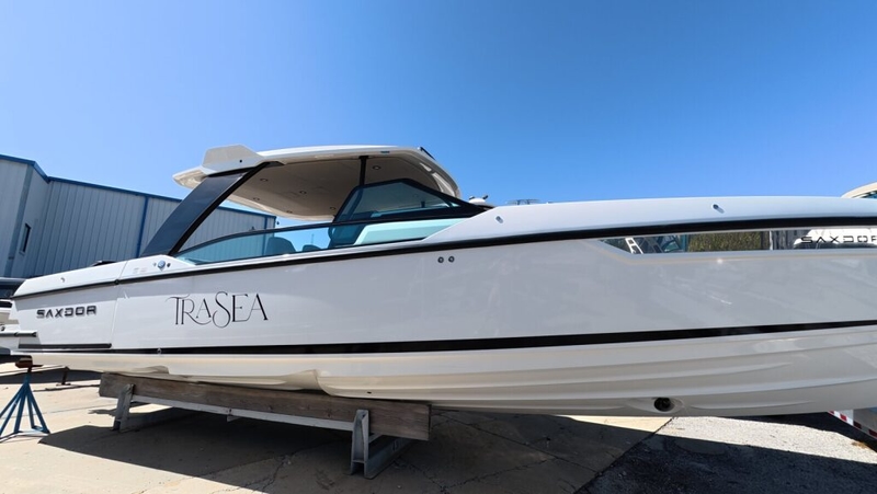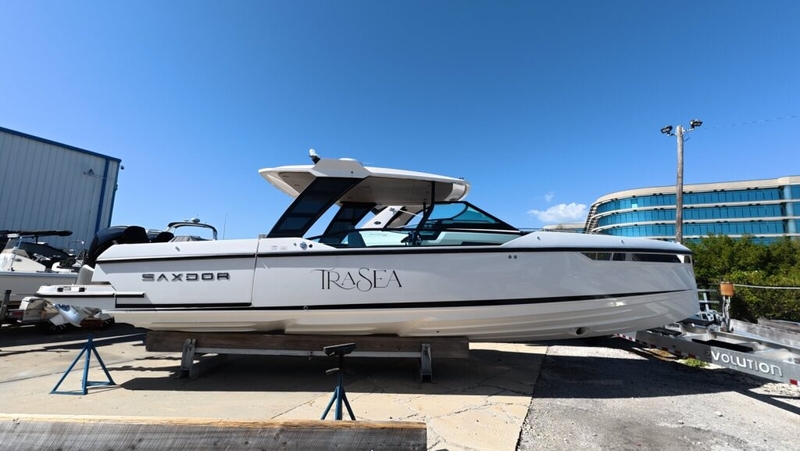 TRASEA is a like-new 2025 Saxdor SX320 GTO with only 20 hours on twin Mercury 300 V8 engines with Joystick Piloting, delivering exceptional performance and effortless docking.