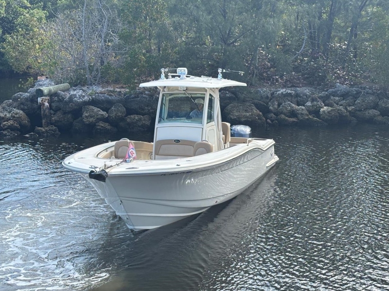 The 2013 Scout 282 XSF (Xtreme Sportfish) is a 28-foot-2-inch center console designed for a mix of luxury, comfort, and fishing capabilities, featuring a 9-foot-6-inch beam and a light, efficient hull. It is highly regarded for its performance, often reaching speeds near 50 knots with twin Yamaha 250s, while offering amenities like a cabin, livewells, and ample seating.