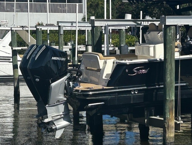 Introducing the MINT Scout 305LXF . This unique opportunity is available for immediate delivery. This boat boats a long list of standard features as well as numerous optional equipment. The power is provided by twin Mercury 300 Verado with low hours and up to date services completed. The acceleration in this boat is outstanding. The fuel burn is perfect for this power to weight ratio as well. This boat is easily manuvered by Joystick piloting, Garmin marine electronics, fully functional and abundant seating, stainless steel rod holders, forward seating with very large lounger in front of console that also houses abundant dry storage, large hardtop, LED lighting throughout, anchor windlass with bow and helm controls, FLAWLESS soft goods, ZERO tears anywhere on this boat's cushions, very large confortable spacious cabin desing and layout , full head with holding tank, livewell. The boat is simply amazing and a great opportunity to own a legend! Call Captain Brad Langdon at 704-215-3599 for a private viewing.