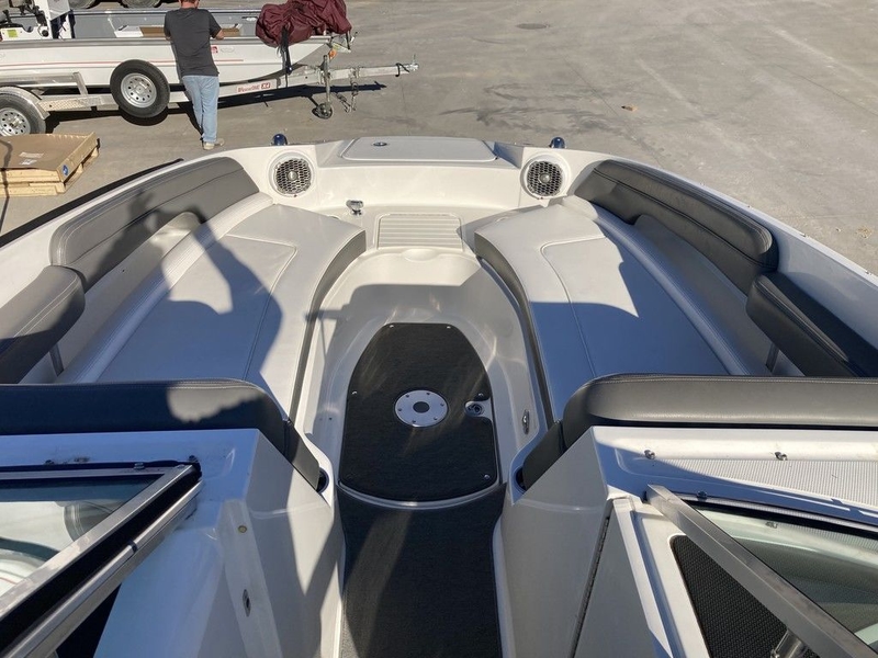 Options include: Mooring cover, bow and cockpit covers, double bimini tops, extended deck, rumble seat, trim tabs, pull up cleats, bow ladder, snap out carpet flooring, tilt steering, head, porta potti, bolster seats, AM/FM/Aux, dual battery switch, smart gauge, ski locker, forward washdown, sink, rear walk-thru and two removable tables. Tandem axle trailer included.