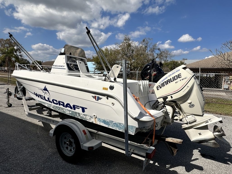 Project boat with trailer. Comes with a 2009 Evinrude 115 Etec. Customer claims engine not running correct.