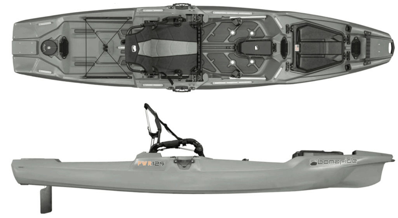 The Bonafide PWR 129 is a 12'9' (389 cm) by 35' (89 cm) fishing kayak designed for superior stability, motorization (bow/stern), and electronics integration, featuring a 500 lbs capacity. It has a modified catamaran hull, weighs 78 lbs (fitted hull), and is 102 lbs fully rigged. Key features include the High Rise seat, Powerlink ports, and a retractable Spring blade rudder.