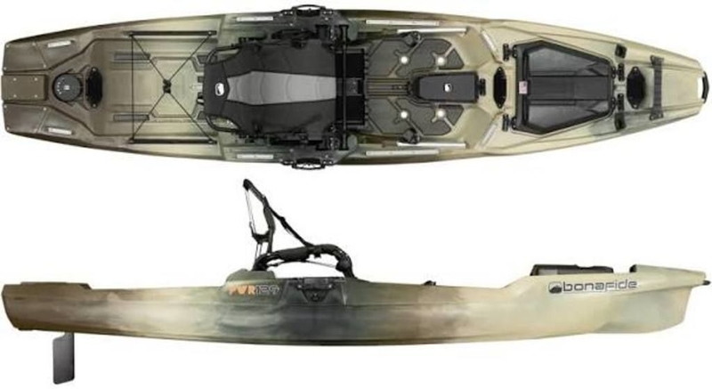 The Bonafide PWR 129 is a 12'9' (389 cm) by 35' (89 cm) fishing kayak designed for superior stability ,motorization (bow/stern), and electronics integration, featuring a 500 lbs capacity. It has a modified catamaran hull, weighs 78 lbs (fitted hull), and is 102 lbs fully rigged. Key features include the High Rise seat, Powerlink ports, and a retractable Spring blade rudder.