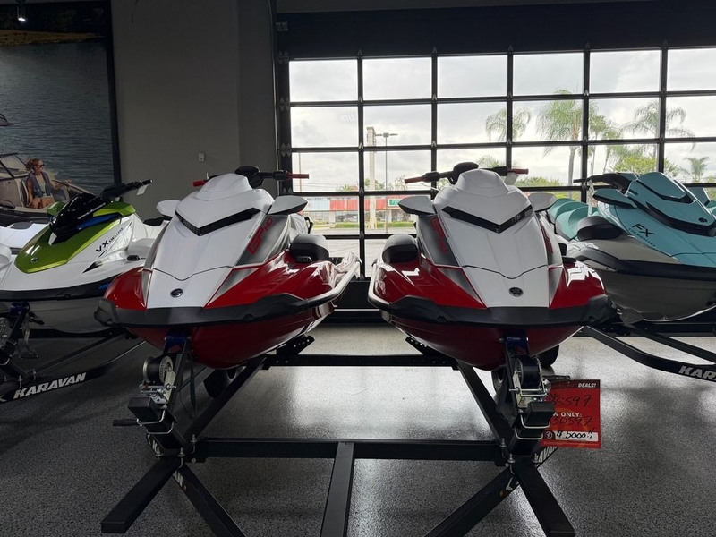 Turn up the excitement on the water with this high-performance, fully equipped personal watercraft package featuring two 2025 Yamaha GP HO WaveRunners with factory audio in striking Torch Red, paired with a 2026 Karavan double trailer—ready for action right out of the gate.