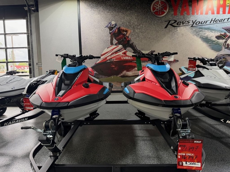 Get ready for nonstop fun on the water with this exciting and agile package featuring two 2025 Yamaha JetBlaster DLX WaveRunners in a bold Imperial Red/Black color scheme, paired with a 2026 Karavan double trailer—perfect for riders looking for lightweight performance and easy handling.