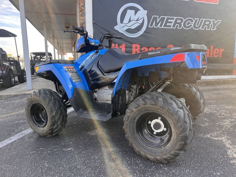 2021 Polaris Sportsman 110 dependable youth ATV with fuel-injected 110cc four-stroke engine, automatic transmission, and electric start. Features parent-adjustable speed limiter, front and rear racks, and a lightweight, easy-to-handle design. Great starter quad thats safe, reliable, and fun for young riders.