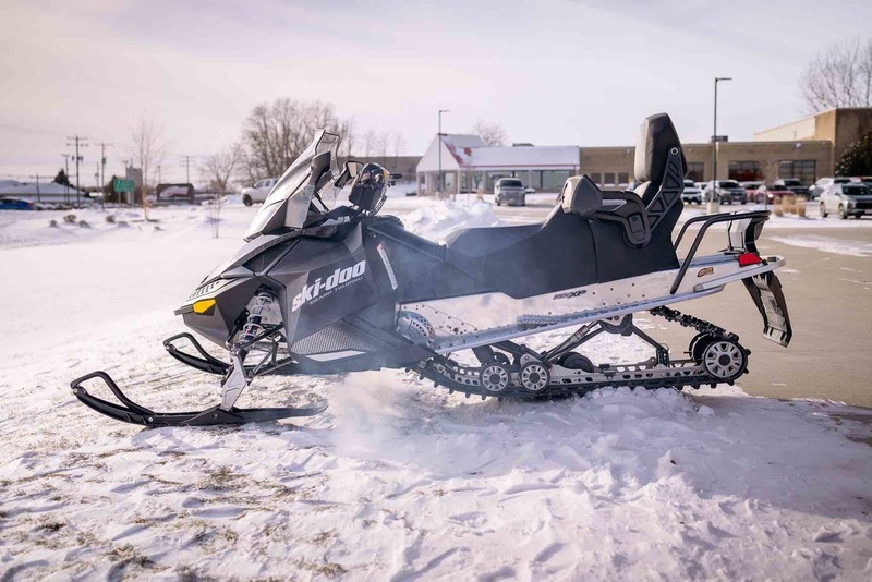 The Grand Touring Sport has a Rotax 600 Carb engine, with electric start, pilot 5.7 SL skis, an 18 in. windshield, straight steel handlebars with J-Hooks, dual A-arm front suspension and 2-up seating.