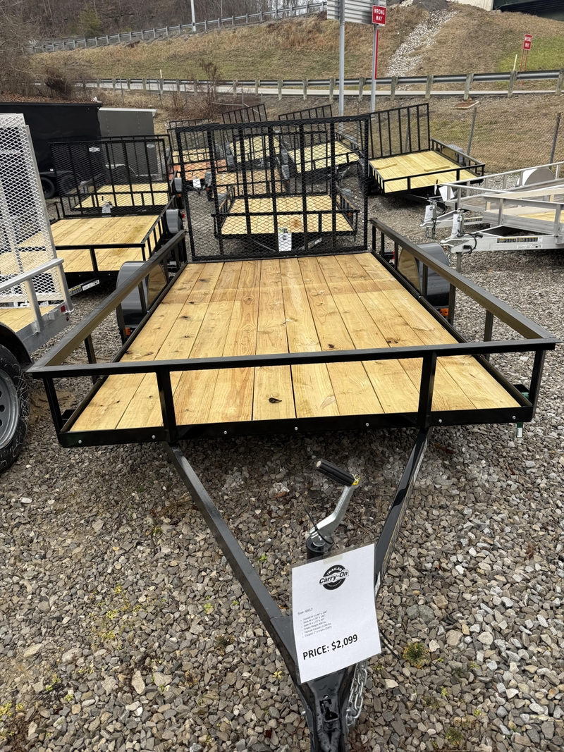 The Carry-On Trailer 6X12GW is a 6-ft x 12-ft single-axle utility trailer designed for hauling, featuring a 2,990 lb. GVWR, 2,090 lb. payload capacity, and a 2x8 treated wood floor. It includes a 49-inch foldable ramp gate, A-frame tongue, and E-Z lube axle, making it ideal for ATVs, equipment, and general tasks