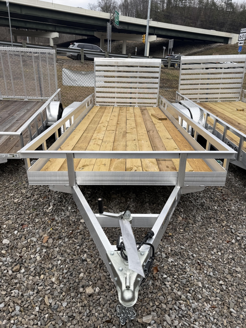The Carry-On 6X16AGW7K-BLK is a 6-foot by 16-foot aluminum tandem axle utility trailer with a 7,000 lb GVWR, designed for heavy-duty hauling. It features a treated wood floor, mesh ramp gate, LED lighting, and 3,500 lb axles with brakes. Key stats include a 1,340 lb empty weight and 5,660 lb payload capacity.