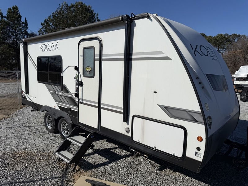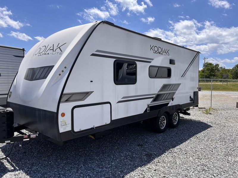 The 2023 Dutchman Kodiak Ultra-Lite 201QB is a compact travel trailer designed for couples or small families, offering a queen bed, full kitchen, and a booth dinette. It features a variety of amenities, including a 10 cu ft refrigerator, a pantry, and an accessible shower. The 201QB also includes features like a power tongue jack, power stabilizer jacks, and easy lube axles.