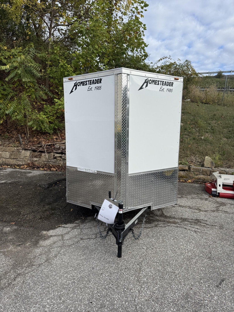 The Homesteader 610IS is a 6-foot by 10-foot enclosed cargo trailer, often part of the Intrepid series, designed for secure storage and transport of items like ATVs or tools. Key features include a steel box frame, an aluminum exterior with a baked enamel finish, a V-nose, a rear ramp door, a side door, a one-piece aluminum roof, and LED lighting. It typically has a single 3,500 lb EZ Lube axle and a 6' or 6'6' interior height.